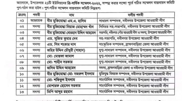 ♦️♦️নবীনগর আওয়ামী লীগের ত্রিবার্ষিক সম্মেলন বাস্তবায়ন কমিটি পুনর্গঠিত♦️♦️ ——————- নবীনগর উপজেলার ২১টি ইউনিয়ন শাখা আওয়ামীলীগের ত্রিবার্ষিক সম্মেলন সম্পন্ন করার লক্ষে গঠিত সম্মেলন বাস্তবায়ন কমিটি পুনর্গঠন করা হয়েছে আজ। সংগঠনটির উপজেলা