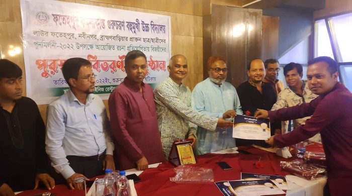 ফতেহপুর কমলাকান্ত গুরুচরণ বহুমুখী উচ্চ বিদ্যালয়ের পুনর্মিলনী উপলক্ষে আয়োজিত রচনা প্রতিযোগিতার পুরস্কার বিতরণী অনুষ্ঠান আজ রাজধানীর একটি অভিজাত রেস্তোরায় অনুষ্ঠিত হয়। গত ১৫ জুলাই এই রচনা প্রতিযোগিতা অনলাইনে আয়োজন